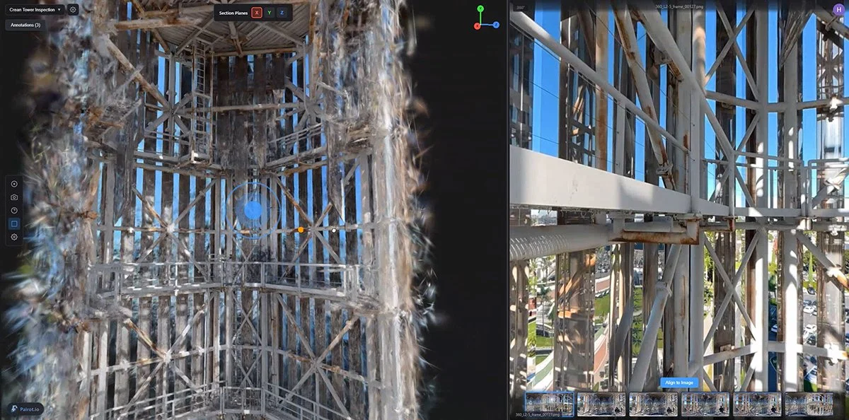 Sixth Eye’s proprietary web application, pairot.app, empowered LERA's engineering team to inspect a 250’ free-standing structure with unprecedented efficiency. By leveraging an intuitive 3D web environment, the app immediately pairs spatial navigation with high-resolution imagery. This enabled the team to filter thousands of photos and hours of video in seconds, ensuring geolocated observations and critical comments remained synced to the model and prepared for report export. This delivered a high-value, data-driven inspection without the risk of lost information.