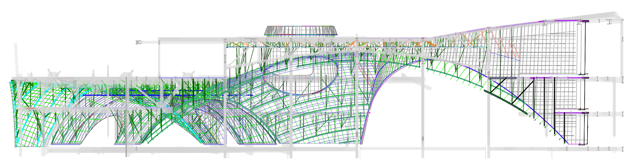 The team provided constructability design-assist for a geometrically complex suspended wood-slat ceiling intricately hung from primary steel, adopting a pre-rationalized wood-slat panel system with 7 typical types to maintain the intended aesthetic. We executed fabrication model and shop drawing across the interior and exterior framing, coordinated with the integrated building enclosure, glazing, and GFRC wraps, and supported mock-ups and field layout. We created direct model-to-machine workflows and issued kitted material sequencing for efficient assembly onsite.